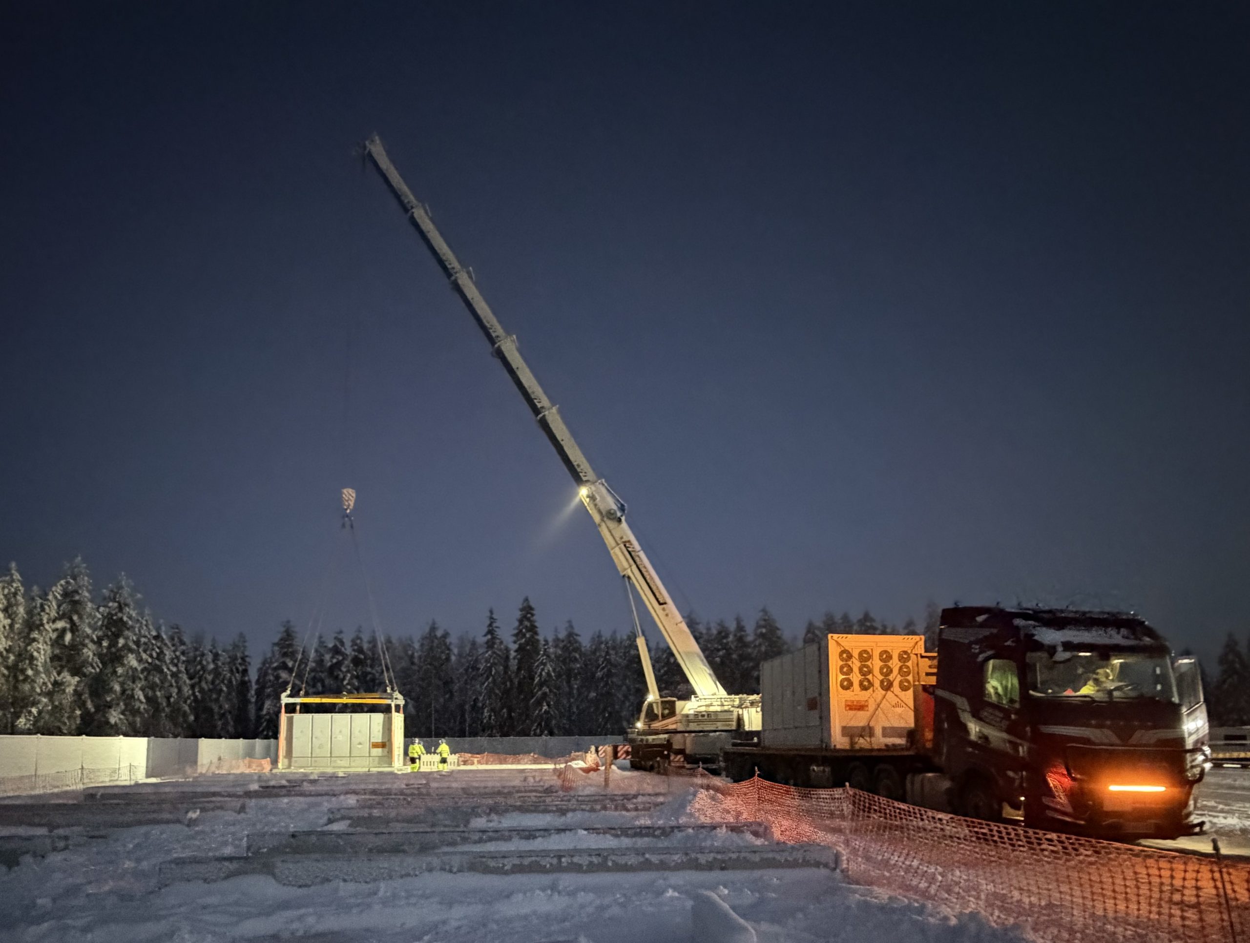 Kuvassa akkukonttia asennetaan paikalleen todellisella talvityömaalla lumen, pakkasen ja pimeyden keskellä. BESS-tarjontamme kattaa koko ketjun aina suunnittelusta ja hankinnasta asennukseen, käyttöönottoon ja elinkaaripalveluihin. Rakennamme luotettavia ja skaalautuvia ratkaisuja niin teollisuuden, energiayhtiöiden kuin uusiutuvan energian hankkeiden tarpeisiin.